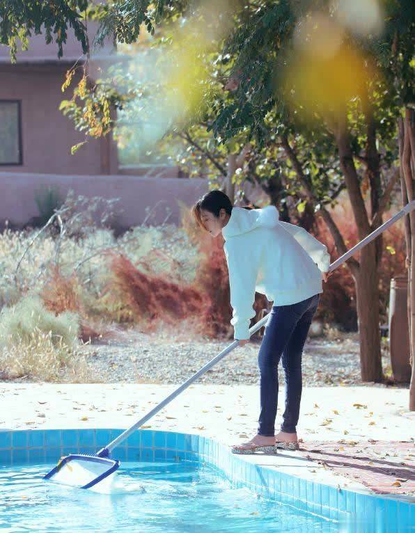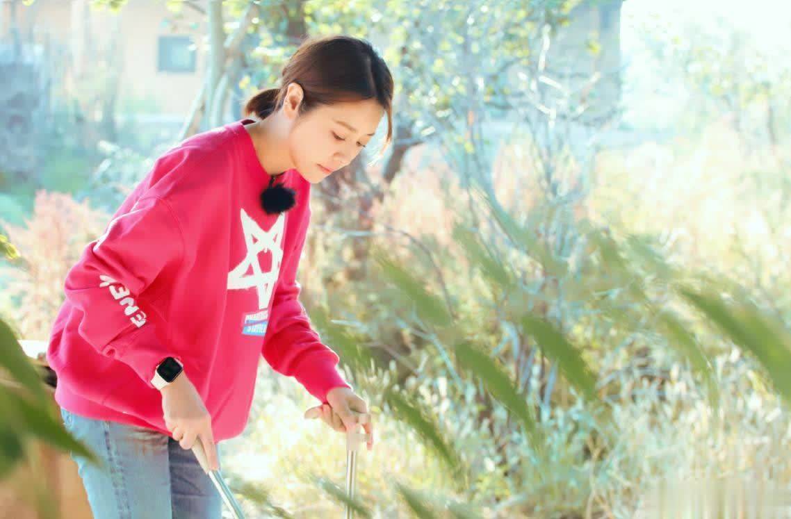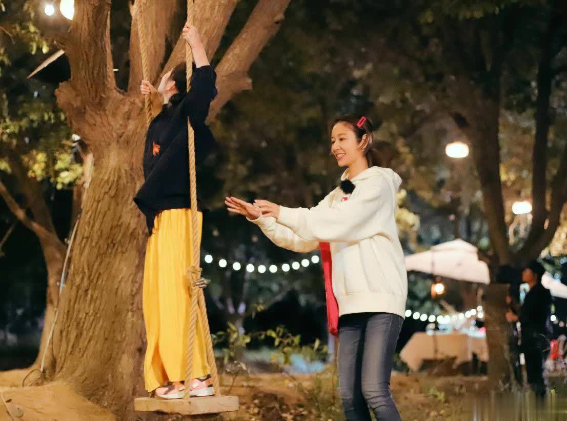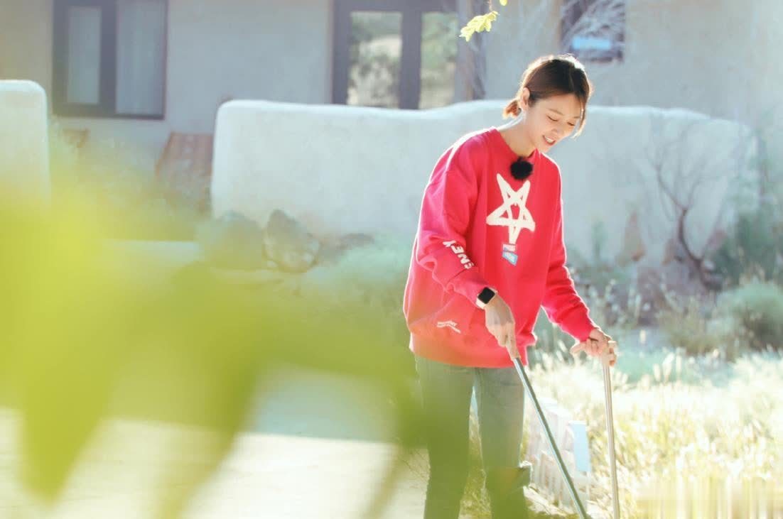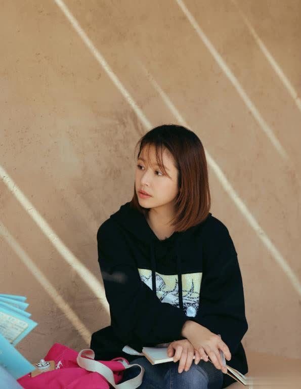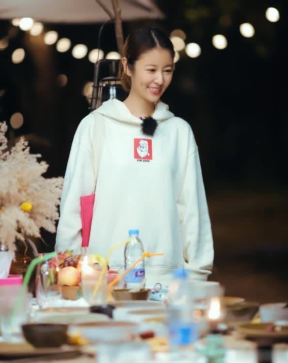 为了避免拖沓感,林心如下半身搭配了深色的紧身牛仔裤,和奶白色的卫衣形成深浅撞色,视觉上干净又清爽,再加上紧身牛仔裤能优化腿部线条,搭配宽松卫衣,上宽下紧的组合显瘦又显高,完全不会压个子。
